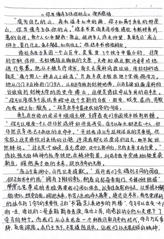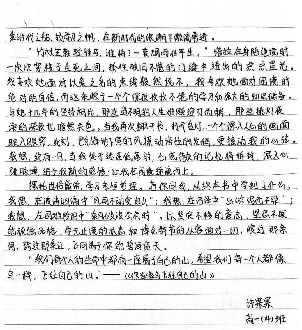 “高山令其渺小,山风让其缄默。”或许我们会遇到不同的困难,但正如书中所说“拥有飞翔的勇气,朝着目标奋勇前行,无惧任何阻碍”廖廖几笔带过的苦难需要我们用心体会,以勇往直前的斗志,以坚持不懈的决心,蜕变自我,拥抱未来,书写人生的伟大篇章。通过这本书,我也更深刻的体会到了学习的重要性,正如“书籍是人类进步的阶梯”,学习可以改变一个人的一生,塔拉的二哥泰勒勤奋苦读,成功上岸,给塔拉幼小的心灵埋下了学习的种子。而我们从小生活在一个科技日新月异的时代,学习方式多样、氛围浓厚,志行于当下,不畏道阻且长,让我们以无畏无惧的精神经乘时代之船,扬学习之帆,在新时代的浪潮下激流勇进。